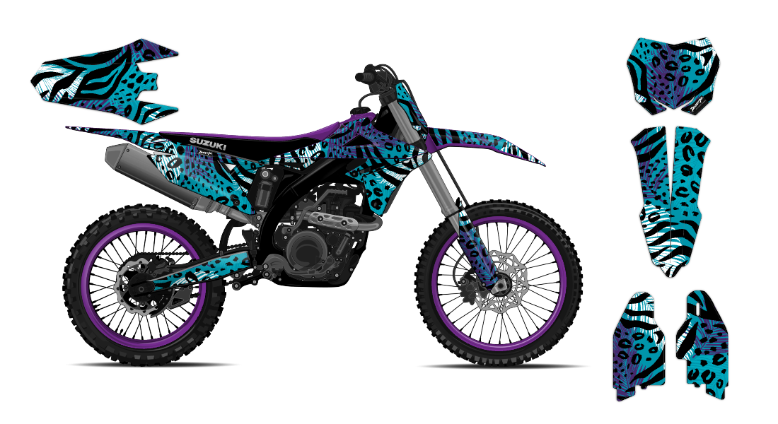 We have taken Suzuki dirt bike graphics (RM, RMX, DR & all other models) a step further with our innovative wrap customizer tool. Let your inner creativity come out as you create a cool leopard print pattern design wrap of your own!