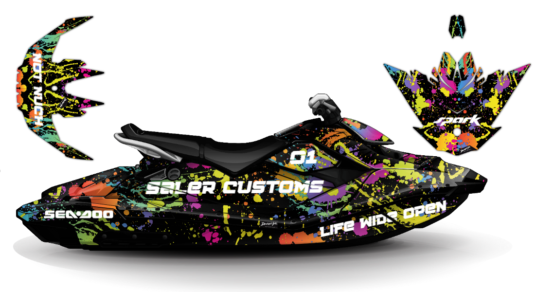 We have taken the Sea Doo Spark (Trixx) wrap designs a step further with our innovative wrap customizer tool. Let your inner creativity come out as you create cool JET SKI WRAPS of your own, like this premium paint splatter design theme!
