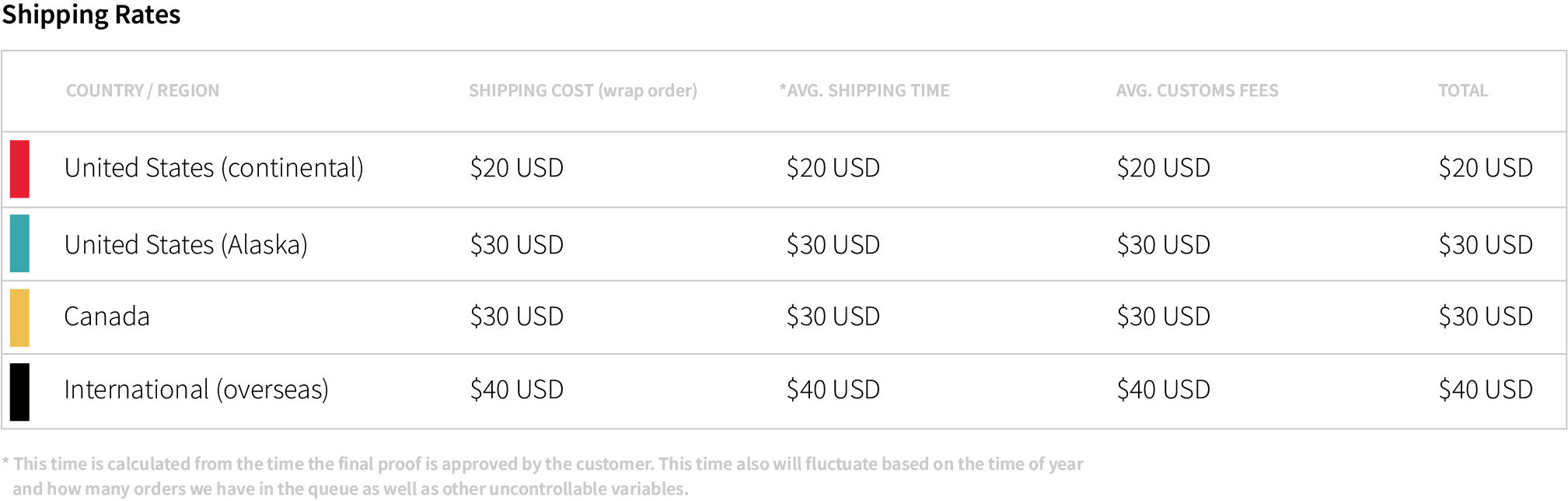 * This time is calculated from the time the final proof is approved by the customer. This time also will fluctuate based on the time of year and how many orders we have in the queue as well as other uncontrollable variables.