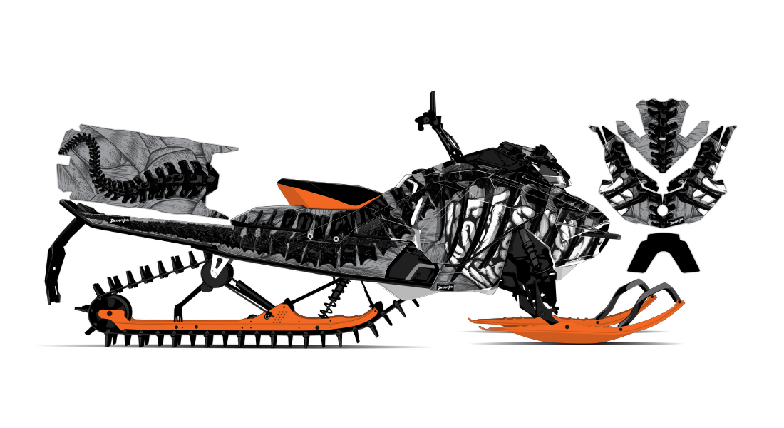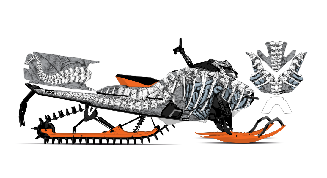 We have taken Ski-Doo Rev Gen4 (Summit, Freeride, Renegade, Backcountry, MXZ, and all other models dating back to the early 2000's) snowmobile wrap designs a step further with our innovative wrap customizer tool. Let your inner creativity come out as you create a cool skeleton spine design wrap of your own!